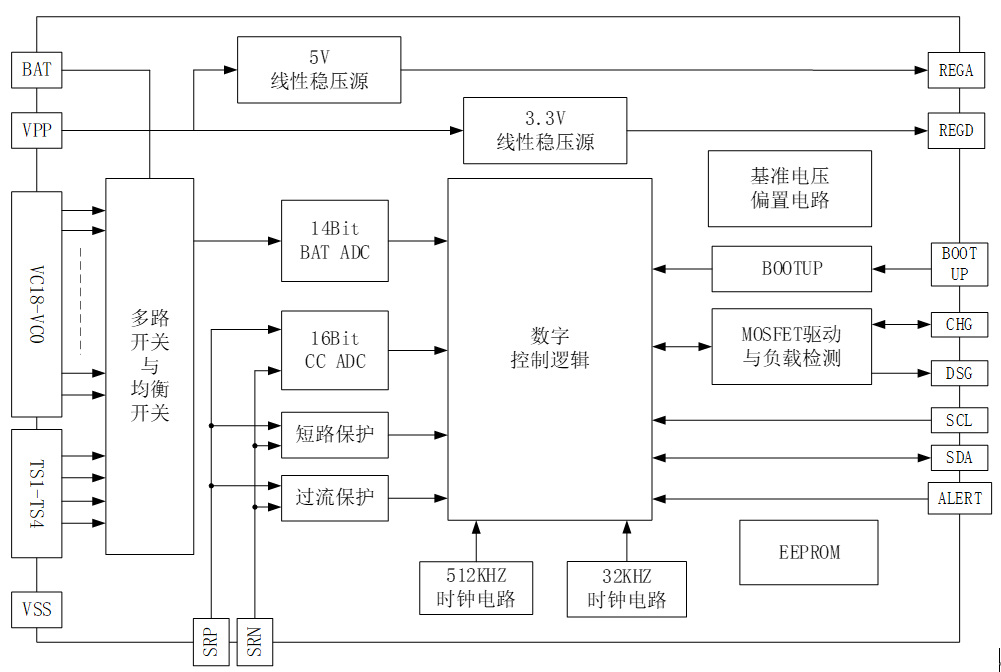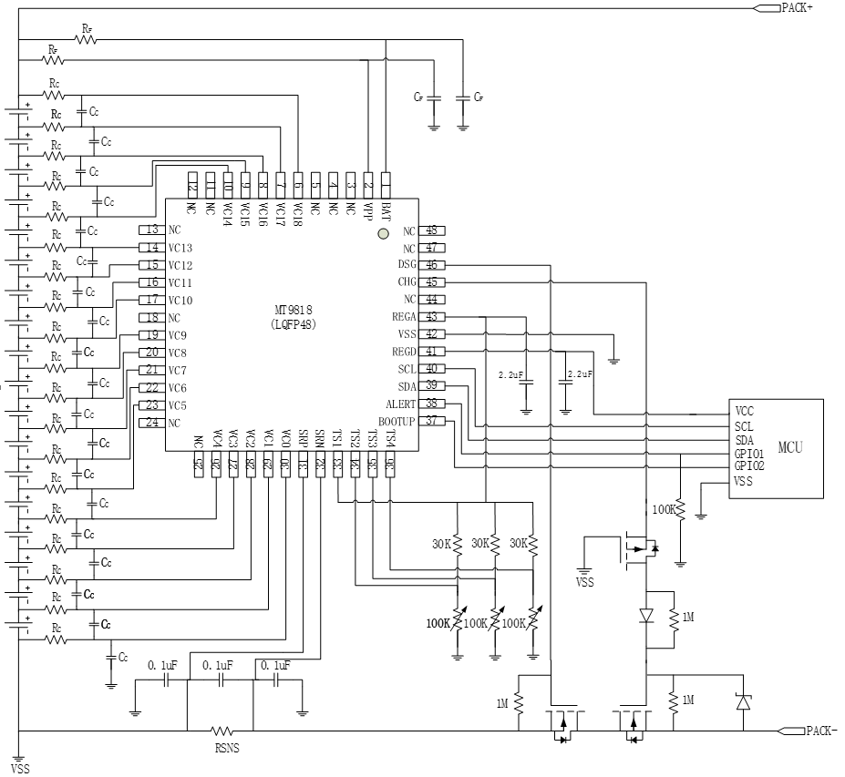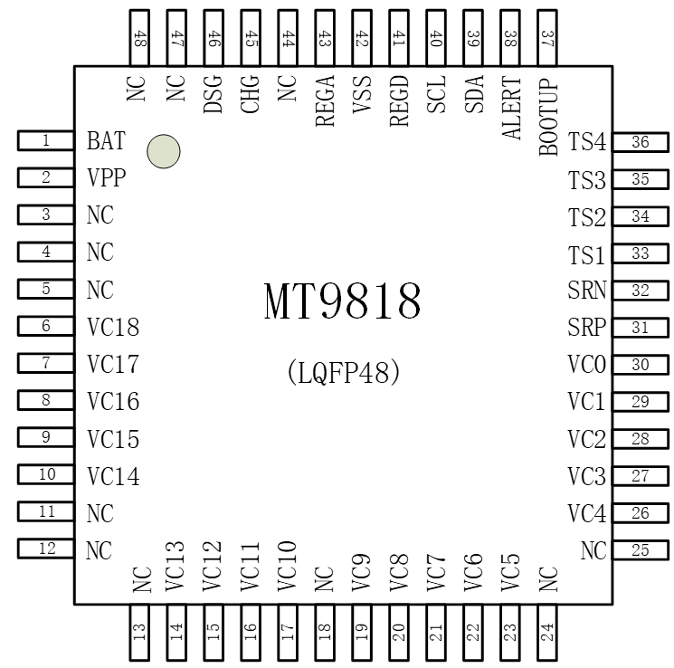 MT9818 是一款低功耗芯片,工作時電流小于 500uA,待機模式下小于 20uA??梢灾С?8~18 節(jié)串聯(lián)電池的信息測量,總的電壓測量范圍為 10~90V。內(nèi)部包括 18 路的 14 位電壓采集 ADC,分辨率 400uV。同時還包含 4 個外部溫度采集通道。MT9818 可提供包括過壓保護、欠壓保護、放電過流保護。此外,MT9818 支持內(nèi)部均衡與外部均衡兩種均衡方式。均衡技術(shù)的應(yīng)用,使電池組特性在充電時保持良好的一致性,有助于延長電池組的使用壽命。MT9818 內(nèi)部含有一個 128 位 EEPROM,存儲 BAT ADC 和 CC ADC 的增益誤差和失調(diào)誤差。MT9818 兼容 I2C 總線接口。