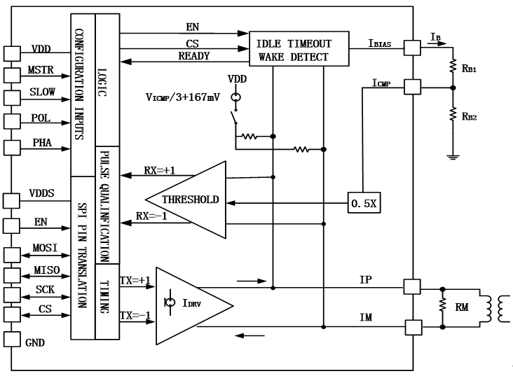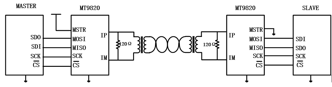 MT9820可通過(guò)單條雙絞線連接在兩個(gè)隔離器件之間提供雙向SPI通信。每個(gè)MT9820將邏輯狀態(tài)編碼為信號(hào),并跨越一個(gè)隔離勢(shì)壘將信號(hào)傳送至另一個(gè)MT9820。接收MT9820 對(duì)傳輸信號(hào)進(jìn)行譯碼并把從總線驅(qū)動(dòng)至適當(dāng)?shù)倪壿嫚顟B(tài)。隔離勢(shì)壘可利用一個(gè)簡(jiǎn)單的脈沖變壓器進(jìn)行橋接,以實(shí)現(xiàn)幾百伏的隔離度。