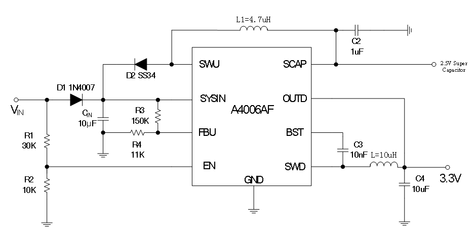 A4006AF8是一款三通道PMU芯片,將高壓Buck DC/DC供電芯片及備用電源系統(tǒng)整合到一顆芯片內(nèi)。內(nèi)部包括一個36V同步Buck降壓變換器、一個低壓啟動18V升壓變換器和一個超級電容器充電器。buck降壓變換器能承受高達(dá)42V的輸入電壓,輸出3.3V時電流高達(dá)450mA。升壓轉(zhuǎn)換器在從2.5V超級電容器或電池供電情況下,能夠提供高達(dá)12V 500mA負(fù)載的輸出。超級電容充電器具有50mA的充電電流能力,同時具有CV功能。