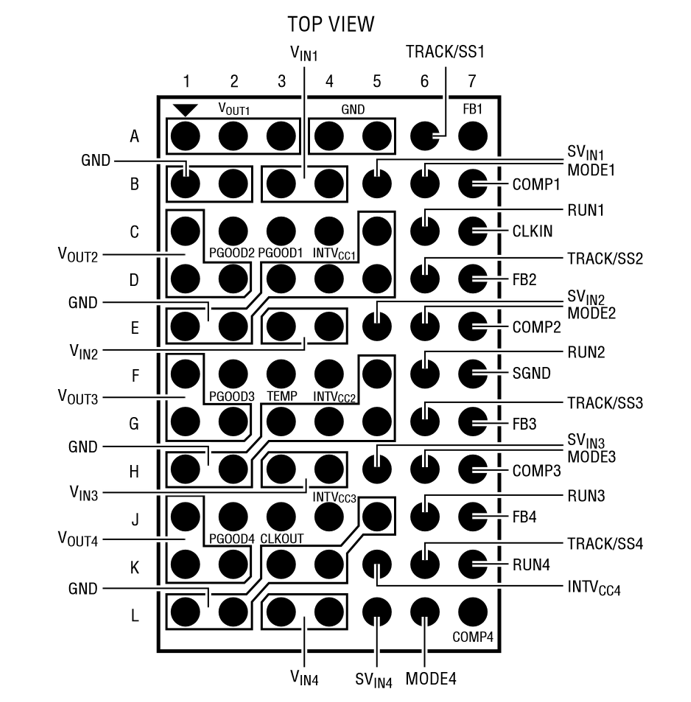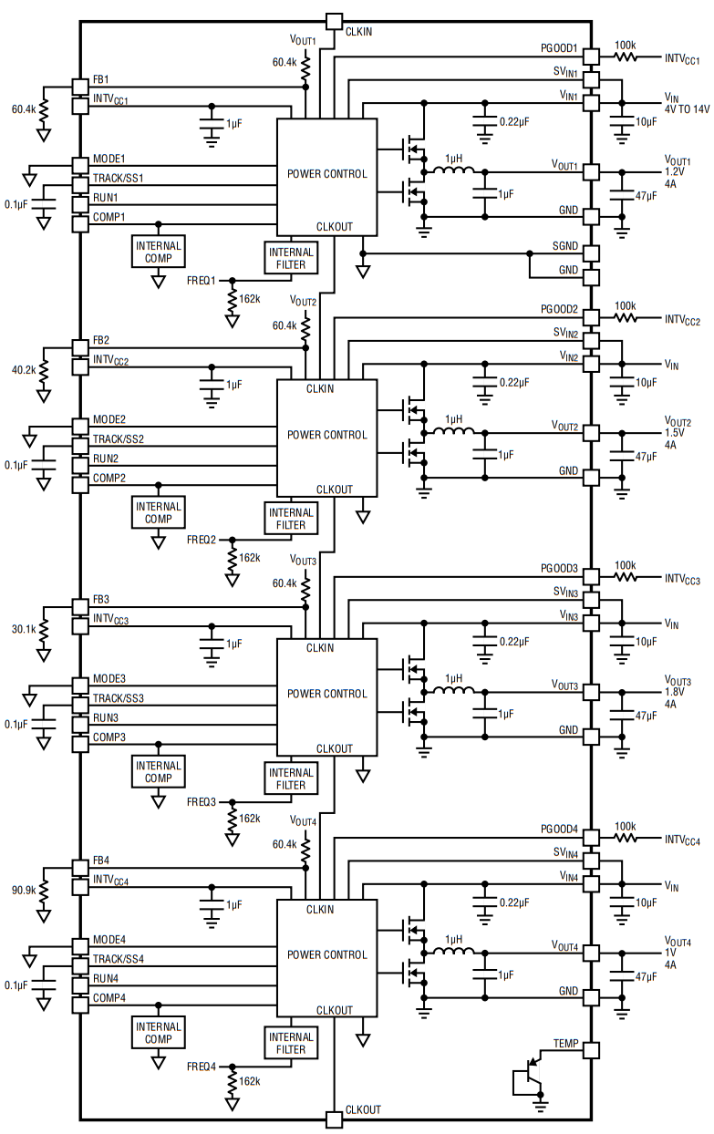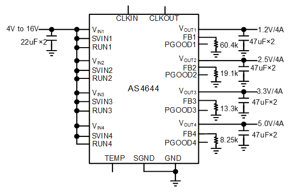 MT4644是一個四路降壓型DC/DC電源模塊,每路可輸出4A直流電流。輸出可以并聯(lián)在陣列中,以實現(xiàn)高達16A的電流能力。封裝中內(nèi)置了開關控制器、功率管、電感器和電阻電容等支持組件。MT4644可在一個4V至16V或2.4V至16V(采用一個外部偏置電源)的輸入電壓范圍內(nèi)運作,支持一個0.6V至5.5V的輸出電壓范圍。其可為每個通道提供4A連續(xù)(5A峰值)的輸出電流。應用時外圍僅需大容量輸入和輸出電容器。