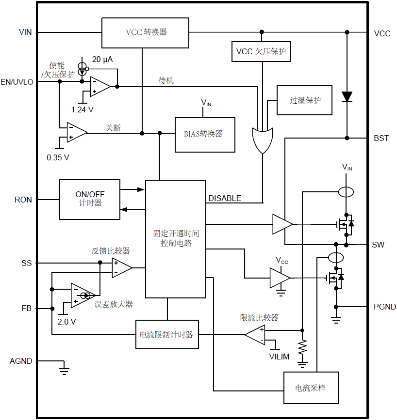 MT2661CF是一款100V、1A的同步降壓轉(zhuǎn)換器,內(nèi)部集成HS和LS開關(guān)。采用恒定導(dǎo)通時(shí)間的控制模式(COT),無(wú)需外部頻率補(bǔ)償,并且具有快速的瞬態(tài)響應(yīng)。內(nèi)部的反饋放大器可以使輸出在全溫范圍內(nèi)保持±2% 的精度。通過(guò)RON電阻設(shè)置每個(gè)周期的開啟時(shí)間,使開關(guān)頻率近似恒定。內(nèi)部具有峰值與谷值電流保護(hù)功能。輸入電壓的欠壓值及遲滯值可以通過(guò)欠壓鎖定電路(EN/UVLO) 調(diào)整。通過(guò)選擇FPWM 引腳的電位,MT2661CF具有不同的工作模式,系統(tǒng)可以在全負(fù)載范圍內(nèi)工作在強(qiáng)制CCM模式,也可以在輕載時(shí)工作在DCM模式。