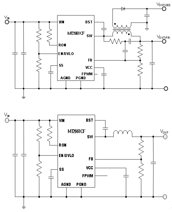 MT2661CF也可以被配置成一個(gè)負(fù)壓輸出。此時(shí)需要注意的是,芯片參考電壓不再是GND,而是負(fù)壓輸出端,因此配置為負(fù)壓時(shí),有效輸入電壓為VIN+|VOUT|。 MT2661CF支持多路輸出及隔離應(yīng)用。 關(guān)鍵參數(shù)